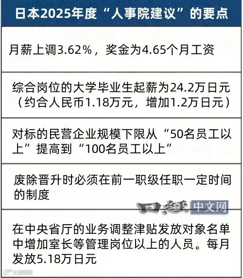 8月7日,日本人事院向国会和内阁提交2025年度“人事院建议”,提出大幅提高国家公务员工资与奖金,旨在增强公务员职业对年轻人的吸引力,并构建更加灵活的人事晋升机制。