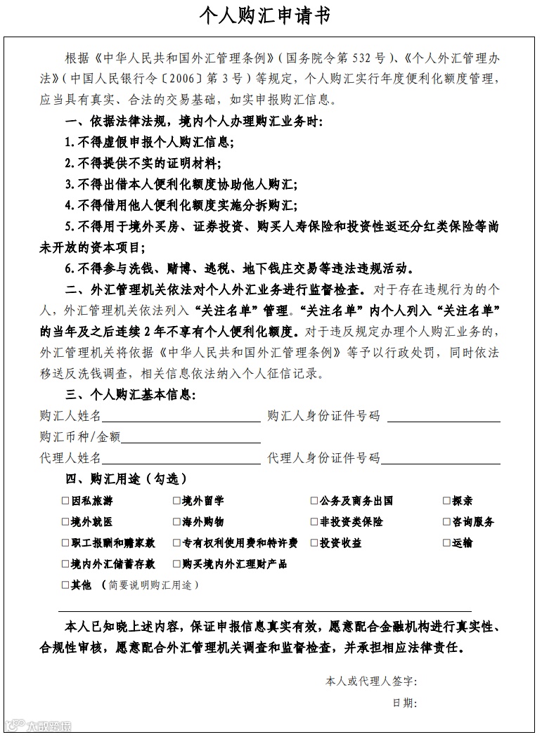 境内个人办理购汇业务时,应真实、准确、完整填写《个人购汇申请书》,并承担相应法律责任。