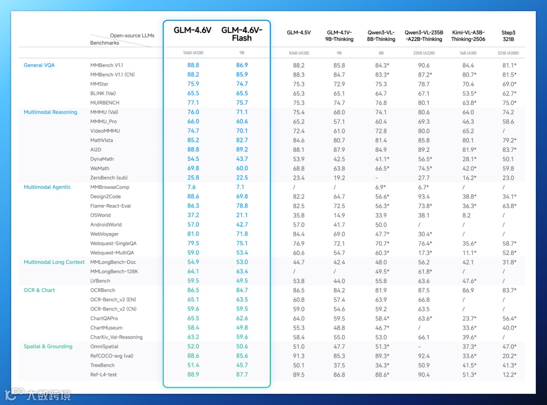 • 轻量版 GLM-4.6V-Flash(9B 参数),对标 Qwen3-VL-8B,在多项指标中实现领先。