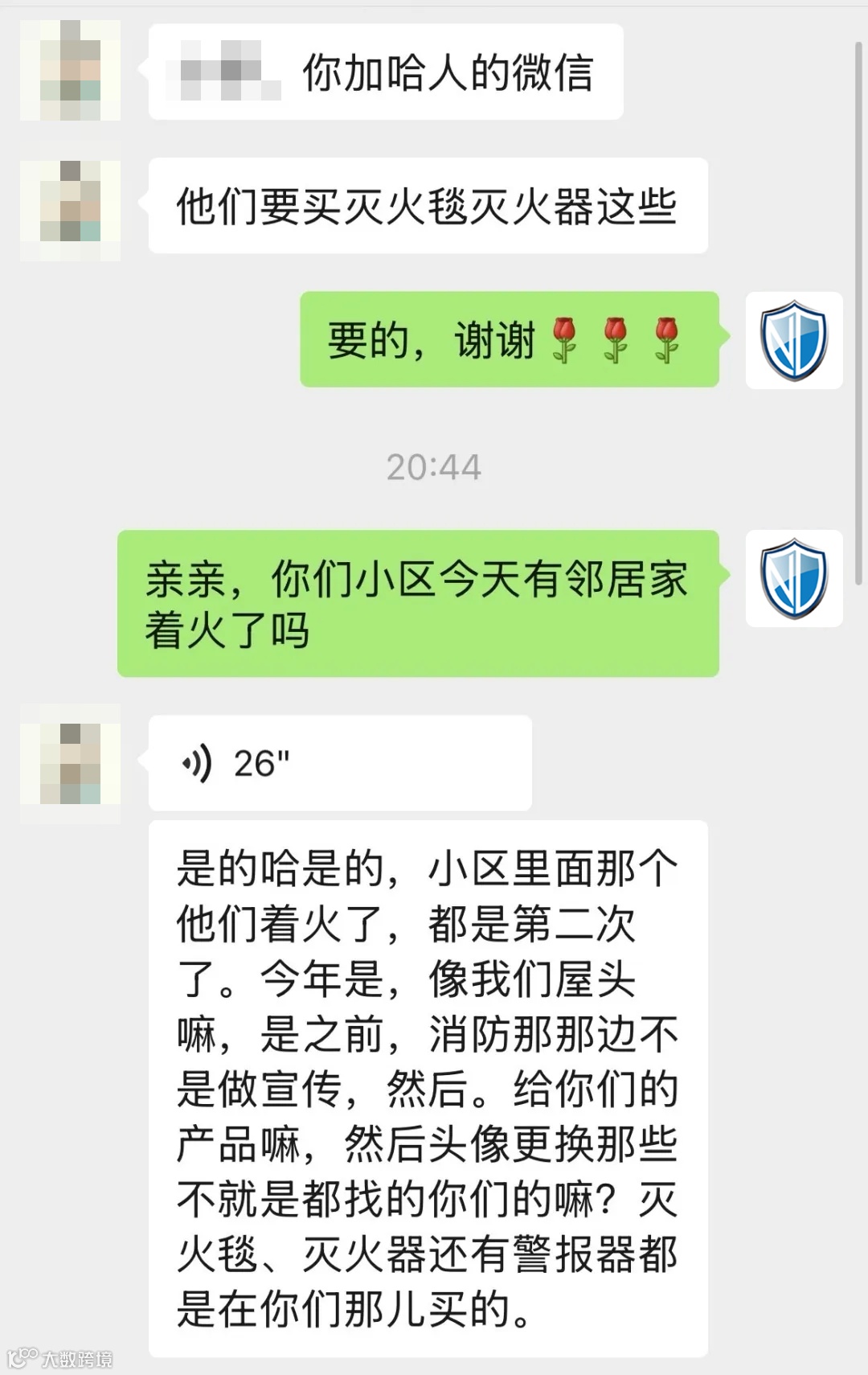 刘女士的分享很快引起了邻居们的关注。王女士(化名)是第一个联系安康诺盾客服的:“今年小区都发生两起火灾了,家里还是准备点灭火的器材,万一发生火灾还能用上,听了刘女士的介绍,立马下单了一套。”