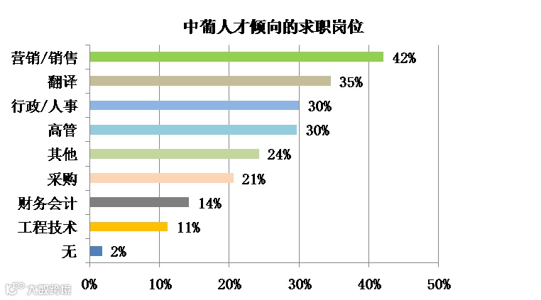 求职岗位方面,销售(42%)和翻译(35%)最受欢迎。行政与高管岗位也较受青睐,而财务会计(14%)和工程技术(11%)则相对冷门,显示专业型复合人才紧缺。