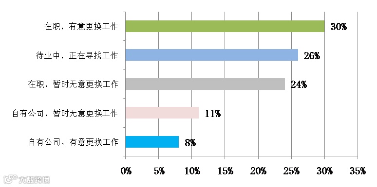 74%的受访者目前在职(其中54%就职于企业,19%自主创业),26%正在求职。值得注意的是,超过半数在职者有意更换工作,反映中资企业面临较高的人才流动风险。