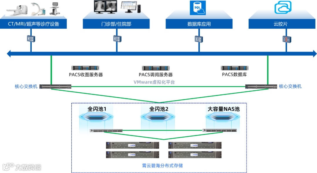 统一存储架构:突破传统存储架构限制,实现文件存储与块存储无缝集成。通过划分不同资源池,一套存储同时满足PACS影像系统(文件存储)与数据库(块存储)需求,降低IT架构复杂度与硬件采购成本。