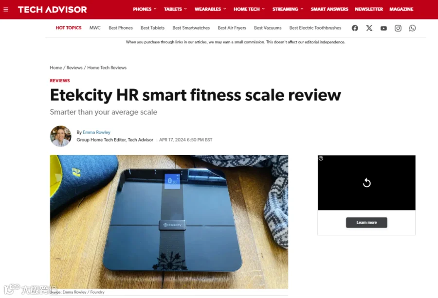 Tech Advisor是全球知名科技博客,月活达1.8M。2024年上线了该款智能体重秤的测评稿件,编辑详细测试了体重秤的准确性,最终给出了高度评价“这是款物超所值的产品”。