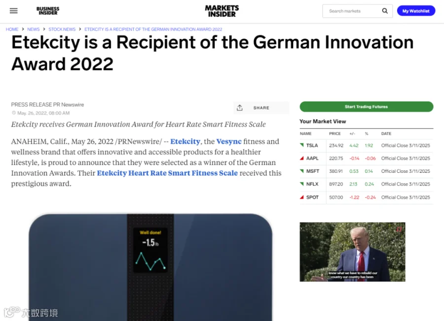 2022年etekcity针对品牌知名度进行一系列提升行动。在获得德国创新奖后,品牌率先进行全球通稿发放,这一稿件被BUSINESS INSIDER、旧金山本地媒体KRON 4等多家知名媒体同步转载,帮助品牌奠定了行业的权威地位。