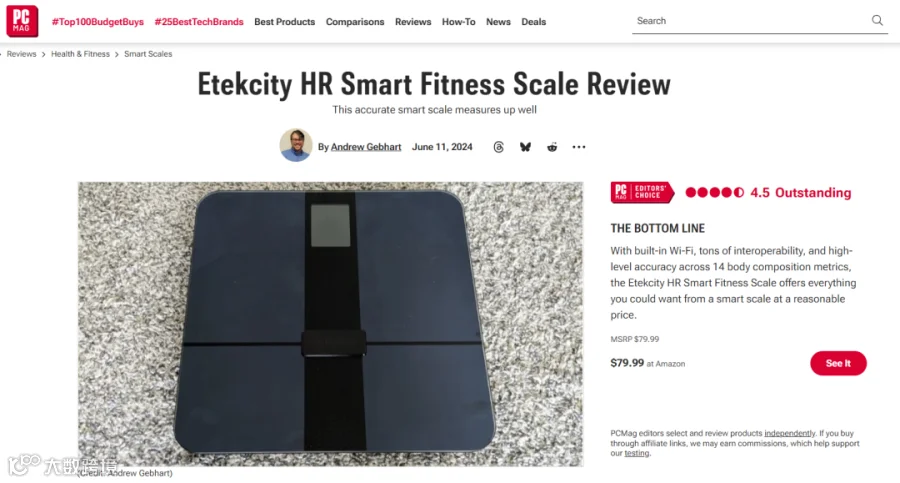 PCMAG作为消费电子领域的顶级科技博客之一,每月拥有千万读者到访。2024年发布了同款体重秤的测评内容,得益于高准确性和APP连接查看身体指数报告,被编辑称为“这是你能买到最好的体重秤”。