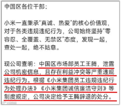 小米的高管——王腾,因为泄露公司信息,被直接辞退了。