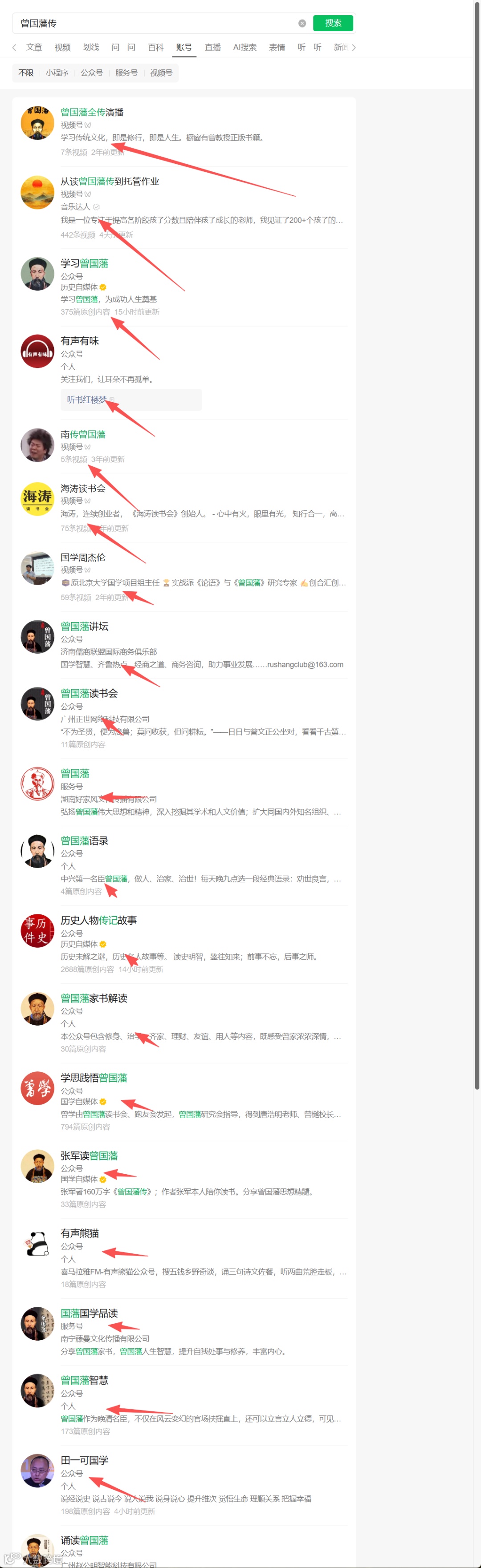 在搜一搜输入关键词找到对标账号,比如你想垂直写曾国藩,在搜一搜输入曾国藩或者曾国藩传,搜文章最热,搜账号,那么就会有无数的对标账号出现,把这些账号都转发到自己的对标账号群中,为下一步批量下载对标账号文章做准备。