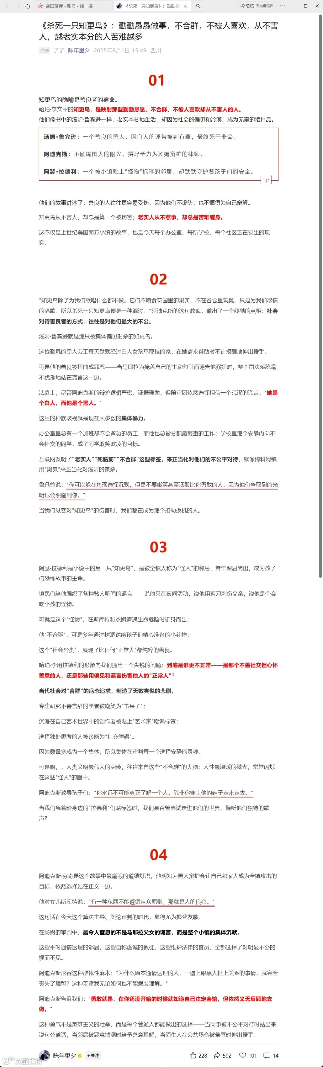 以经典书籍 / 权威人物 IP 开篇,格式:《XX》:当你【有某类经历 / 接触某类人多了】,就会发现,【罗列 3-6 个具象化的 “缺点式” 行为 / 性格特征】,往往才是【与 “缺点” 相反的正面特质】的那类人;引用 IP 作者观点,点出核心背景(如人性复杂、时代特征),强化权威;抛出核心判断标准:真正的【正面特质】,往往不在于表面的【大众固有认知的正面表象】,而在于内心的【核心本质特质】;结合当下社会现状(如讲究包装、情商热),描述受众固有偏好,制造认知冲突;用 “然而 / 但” 转折,再次强调核心反常识观点,并用比喻美化表达,引发情感共鸣。中间分论点模板提示词(每个分论点 11 句左右,建议 3 个分论点)每个论点加入我的具体案例(植入你的个人IP):用 “01/02/03+ 分论点” 开篇,分论点格式:【“缺点式” 特征】的人,往往【对应的正面特质】;引用 IP 书籍金句,建立 “特征→本质” 的逻辑关联,提供理论支撑;描述受众对该 “缺点式” 特征的固有偏见,引发共鸣;罗列 2-3 个具体行为,具象化 “缺点式” 特征,让读者有代入感;用 “但恰恰相反 / 实际上” 转折,抛出正面结论,呼应分论点;用 “没有... 不会... 更不会...” 的递进句式,从反面论证分论点;用 “他们会.../ 有什么... 就...” 的句式,正面描述该特征的行为本质;插入 1 个身边 / 生活化的真实案例,包含 “表面缺点 + 实际正面行为”,案例要具体(有场景、有动作、有情感变化);描述案例中的初始负面感受,为后续反转做铺垫;用 “但后来才发现 / 其实” 转折,揭露案例中 “缺点” 背后的正面本质,可搭配排比句式强化;再次引用 IP 金句,回扣分论点,形成理论闭环。结尾模板提示词:以 “写在最后” 标识收尾;引用 IP 书籍 / 权威人物的结尾金句,升华内容立意(从 “识别他人” 到 “人生智慧”);结合当下社会现状,给出核心行动方法论:学会透过现象看本质;总结前文核心观点,用排比句式逐一呼应 3 个分论点,将 “缺点” 转化为正面特质,形成逻辑闭环;用 “愿你我” 提出第一重期许:拥有【识别他人本质】的能力,找到【正面特质的人】;用 “也愿” 提出第二重期许:从 “识别他人” 延伸到 “做好自己”,保持【核心正面特质】,在【当下复杂环境】中,做一个【简单 / 真诚 / 善良】的人;结尾简洁有力,不冗余,留存情感共鸣。