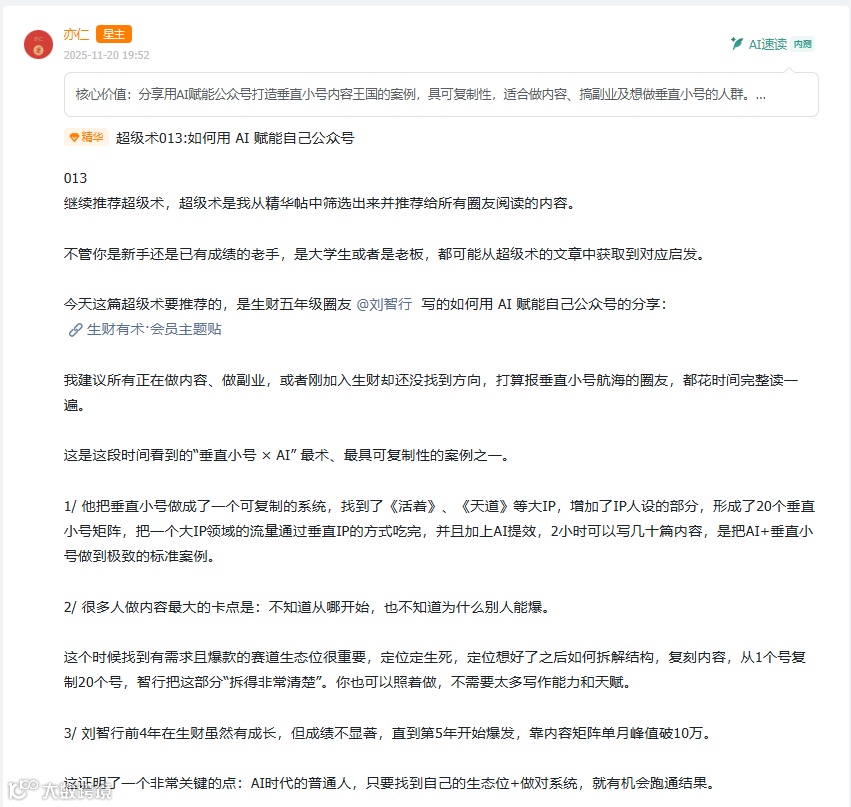 它往往能代表生财有术的核心方法论和思维方式,看完一篇就能值回门票。这些帖子不仅能开阔你的认知边界,提升创业思维与能力,还能在工具、方法、路径上带来直接启发。