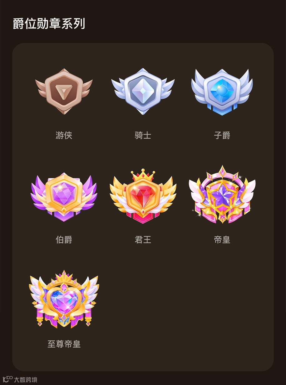 还有专门打造的爵位勋章:从入门级到至尊帝皇。每一级勋章都以更华丽的外观标注着在公园里的高阶身份,是专属的荣耀象征与尊崇标识。
