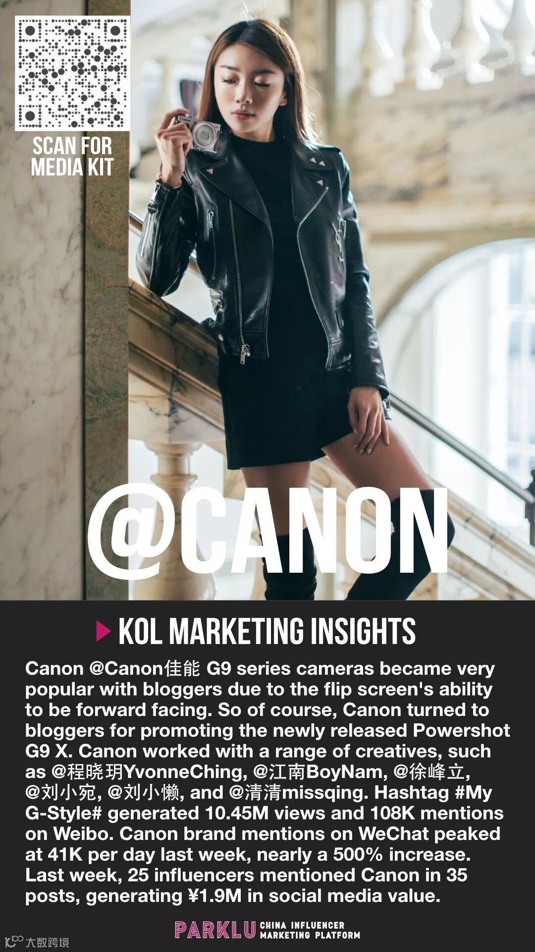 In particular, Canon’s G9 series cameras have become very popular among Chinese influencers due to the flip screen’s ability to face forward. Canon turned to bloggers for promoting the newly released Powershot G9 X, working with a range of creatives, such as @程晓玥YvonneChing, @江南BoyNam, @徐峰立, @刘小宛, @刘小懒, and @清清missqing. During the campaign, 25 influencers mentioned Canon in 35 posts, generating ¥1.9M in social media value.