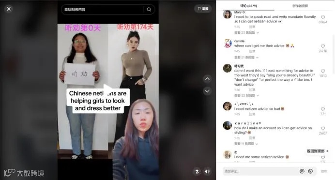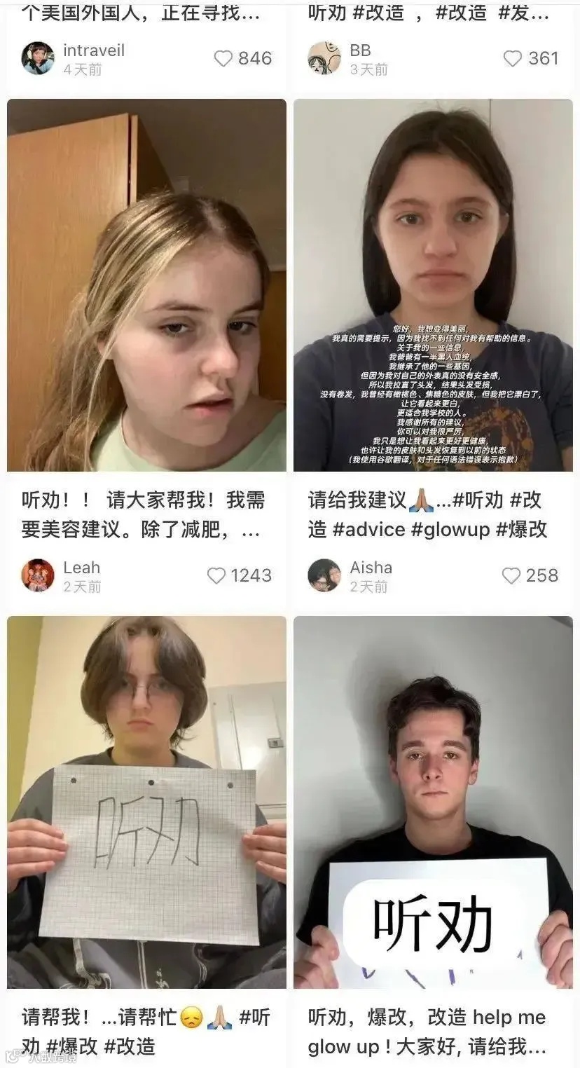 2024年1月15日,中国知识科普类博主candiselin86 在Tiktok发布了一支视频。她上传了小红书上素人听劝改造的帖子截图,配上改造前后的图片,并讲解道:「中国网友正在帮助女孩们变得更好看。」
