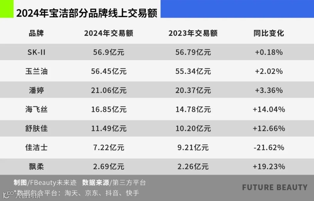 财报数据显示,宝洁大中华区销售在2025财年Q1下滑15%后,Q2迅速收窄至3%,复苏趋势明显[1]。核心品牌SK-II、OLAY、潘婷、海飞丝、飘柔在2024年线上销售普遍实现增长[1]。