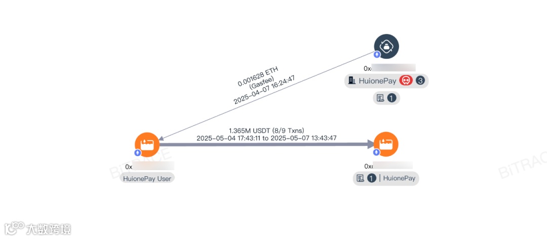 Bitrace 遍历所有 HuionePay User 地址转账交易数据后,成功定位到某个以太坊地址,该地址在 5 月 4 日至 5 月 7 日之间收取并向 HuionePay 热钱包地址转移价值 136.5 万美元的 USDT 代币。