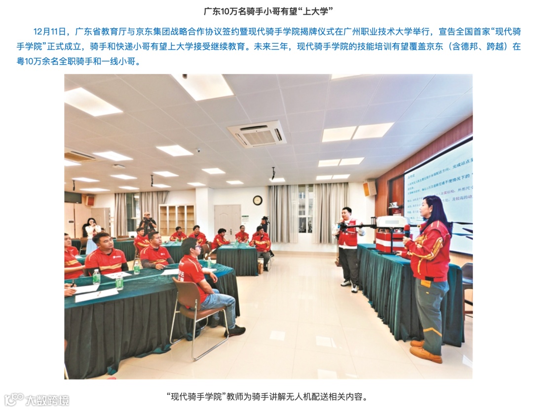 这是广东省教育厅跟京东集团签的战略合作,地点在广州职业技术大学。据说未来三年要覆盖广东超过10万名京东的全职骑手和小哥
