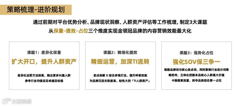 通过前期对平台优势分析、品牌现状洞察、人群资产评估,项目团队制定三大课题,以实现内容营销效能最大化: