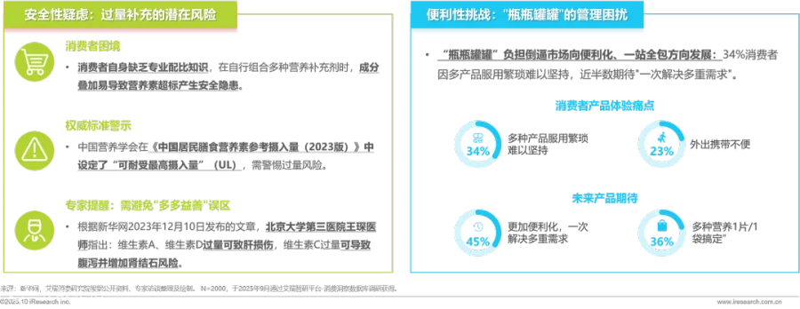 营养补充多元化趋势下,消费者面临安全性与便利性双重挑战。安全性方面,自行组合多种补充剂易导致成分叠加超标,中国营养学会设定的"可耐受最高摄入量"常被忽视,维生素A、D、C等过量摄入可引发肝损伤、肾结石等健康风险。便利性方面,34%消费者因多产品服用繁琐难以坚持,45%期待一次解决多重需求,"瓶瓶罐罐"管理负担凸显。多元化需求与安全便利矛盾日益突出,倒逼市场向一站式科学配方方向发展。