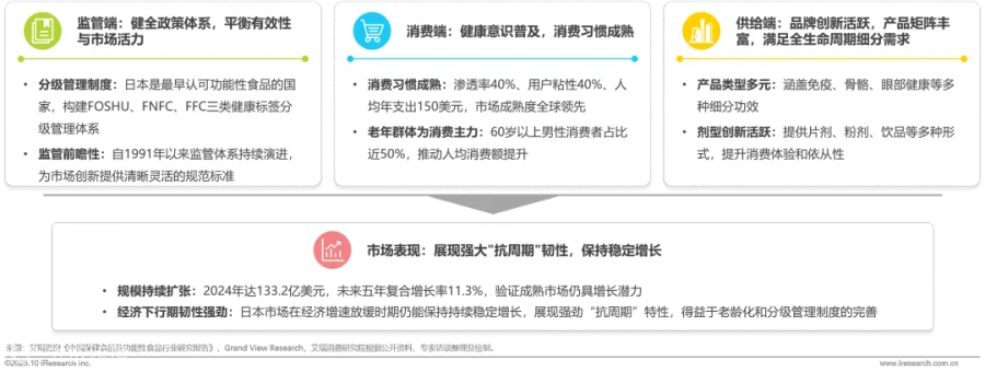 鉴于美国市场发展路径与消费人群差异较大,亚洲近邻日本市场经验更具借鉴价值。日本通过监管端分级管理体系平衡产品有效性与市场活力,消费端形成40%渗透率、40%用户粘性的成熟习惯,供给端产品矩阵丰富满足全生命周期需求,共同驱动市场在经济下行期仍保持稳定增长。2024年市场规模达133.2亿美元,未来五年复合增长率11.3%,展现强劲"抗周期"韧性,为中国在老龄化、品类管理、产品创新等方面提供成熟范本。