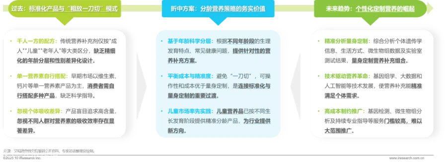 中国营养补充市场正经历从标准化向精准化的演进。传统"千人一方"模式忽视个体差异,消费者需自行搭配单一营养素产品且缺乏科学指导;完全个性化定制虽能通过基因组学、大数据等技术实现精准营养干预,但基因检测、微生物组分析等高昂成本制约大规模推广。分龄营养策略成为务实过渡方案,基于年龄段生理特点科学分层,在避免"一刀切"盲目性的同时兼顾成本效益,儿童营养品市场的成功实践为行业转型提供了可借鉴路径。