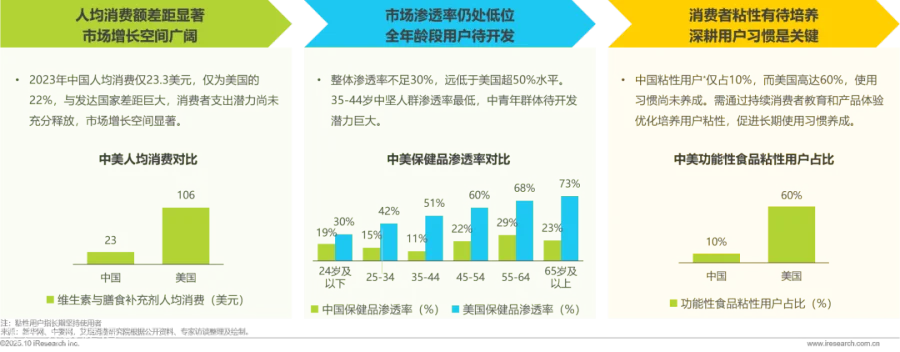 中国营养补充剂市场虽已具备可观规模,但与成熟市场相比仍存在巨大增长空间。2023年人均消费仅23.3美元,仅为美国的22%;整体渗透率不足30%,远低于美国超50%的水平,35-44岁中坚人群渗透率最低,揭示中青年群体待开发潜力;粘性用户仅占10%,而美国高达60%,消费习惯尚未养成。三大维度的显著差距表明,通过持续消费者教育和产品体验优化,中国市场具备长期高增长的坚实基础。