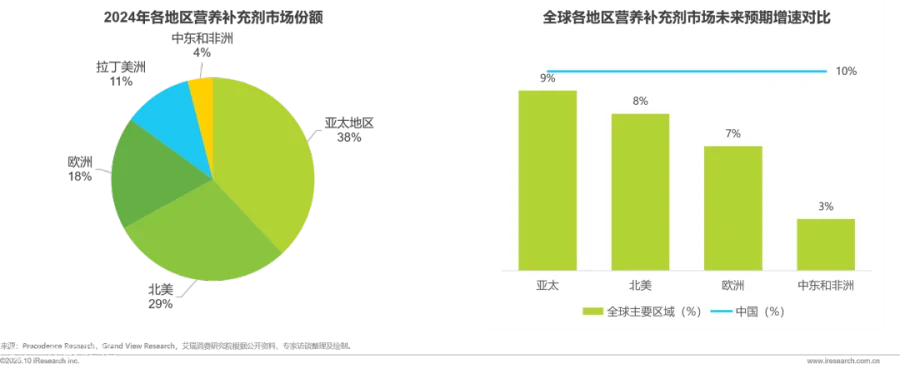 全球营养补充剂市场呈现明显的区域分化特征:2024年亚太地区以38%的市场份额居全球首位,北美和欧洲分别占29%和18%。从增长动能看,亚太地区以9%的增速领跑全球,显著高于北美8%和欧洲7%的增速水平。作为亚太地区的核心增长引擎,中国市场增速达10%,不仅远超全球主要地区,更彰显出巨大的市场潜力和发展空间,成为全球营养补充剂产业最具活力的增长极。