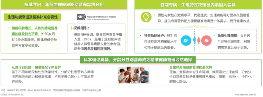 分龄分性别营养方案具备坚实的科学理论基础。年龄维度上,人体对营养素的吸收能力随生理功能衰退而变化,美国NIH明确指出膳食营养素参考摄入量因年龄而异,需针对不同年龄段提供精准补充方案;性别维度上,男性对锌的特殊需求、女性因生理周期对铁的高需求等差异显著,激素水平与代谢特性的不同要求专属营养配方。基于这些科学共识,分龄分性别营养成为贯穿全生命周期、实现从标准化到个性化精准健康管理的必然选择。
