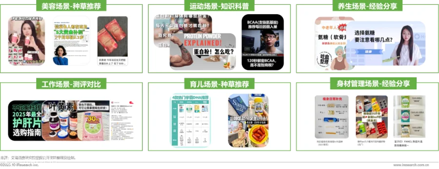 社交媒体内容呈现营养补充多元化趋势。场景维度上,从办公室护眼抗疲劳到健身运动营养,从美容养颜到中老年养生,覆盖全生命周期;内容形式上,知识科普、测评对比、经验分享、种草推荐等多样化表达满足不同信息获取需求;人群圈层上,职场人士聚焦助眠护肝,银发族注重骨骼心血管健康,营养补充正从标准化向个性化、精准化方向演进。
