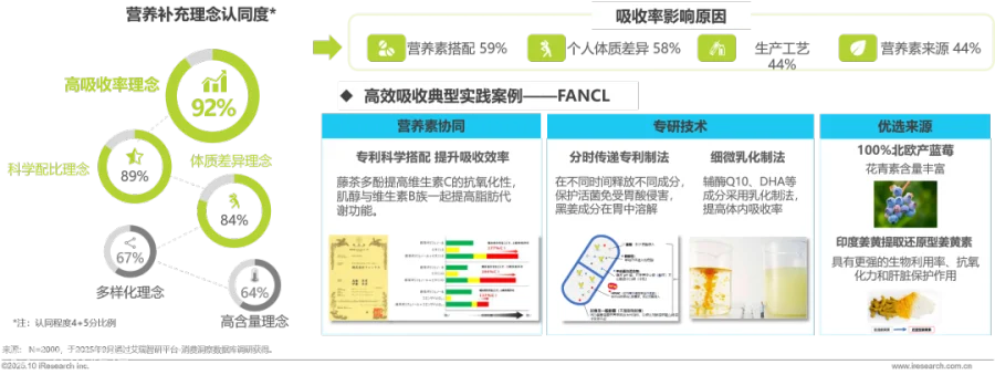 消费端营养补充理念已从关注“含量多少”转向“吸收多少”,92%消费者认同高吸收率、89%认同科学配比,认为吸收率受营养素搭配、个人体质、生产工艺等因素影响。FANCL以"营养素协同、专研技术、优选来源"为核心实践,通过专利搭配、分时传递制法、细微乳化工艺等创新,将高吸收理念转化为产品力,推动行业从粗放式"堆料"向精准化"高效"进化。