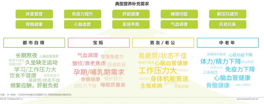 不同人生阶段、生活场景的人群均展现出对营养补充的关注:应对职场压力、熬夜久坐等状况的都市白领,面临家庭与工作双重压力的宝妈群体,对抗疲劳、身体机能衰退的男友/老公群体,以及针对骨骼、心脑血管等问题开展预防性干预的中老年群体;体重管理、免疫力提升、肝脏健康、睡眠问题、解压抗疲劳、抗老抗衰、心脑血管、美容养颜、骨骼健康等成为典型营养补充需求方向,体现出全民健康管理意识的提升。