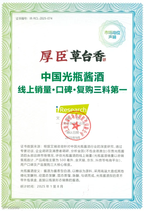 近日,艾瑞咨询正式授予厚臣草台香:“中国光瓶酱酒线上销量、口碑、复购三料第一”的市场地位证书。基于对光瓶装酱香型白酒(“光瓶酱酒”)市场的深度调研分析以及品牌的综合评估,充分认可厚臣草台香在光瓶酱酒市场的标杆地位。
