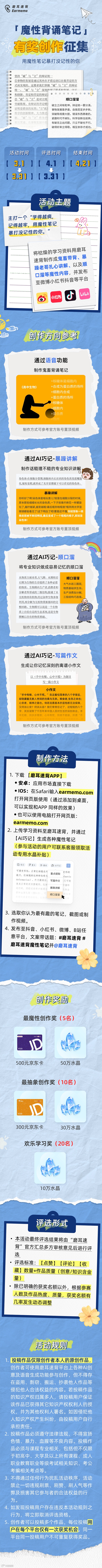 带 #磨耳速背 和 #磨耳速背魔性笔记 双Tag,按要求创作并发布将学习资料制作成鬼畜音频带背、暴躁老哥扎心讲解、顺口溜以及各种脑洞打开的魔性创意背诵笔记,即可参与有奖征集活动。