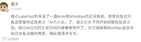 看了晚点写月之暗面和MiniMax,阑夕在即刻感叹了一波。晚点写的很好了,阑总也已经总结得很好了,我就不再班门弄斧