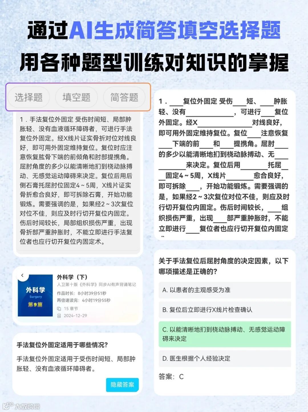 900多页的内科学,800多页的外科学......医学生的“蓝色生死恋”,没有重点,全本背诵. 过于冗长拗口的表达让人看得云里雾里。现在就用AI来帮你开挂,让知识更高效地被刻录进你的大脑。