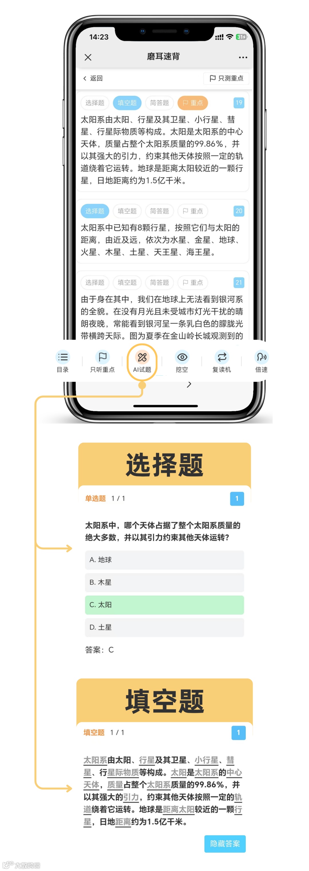 将传统教材与复习资料升级成为集听读功能于一体的智能有声学习机,仅需简单上传,普通文本即可获得多项AI增值功能,包括AI自动生成考题、AI查询及全网信息检索、重点段落循环播放及个性化的“番茄时钟”设置等,显著提高了学习效率,使原本单调乏味的复习过程变得更为生动、有趣且高效。