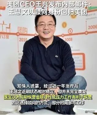 4月2日,美团CEO王兴发布内部邮件,称王慧文逐步恢复健康,将用部分时间承担美团顾问一职。