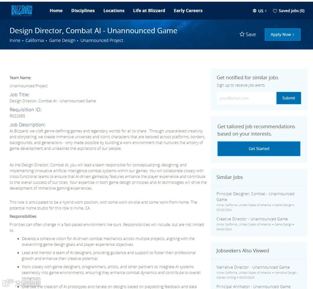 暴雪正在为一个尚未公布的3A新作招募多个高级职位,包括创意总监,设计总监(战斗AI),高级特效美工,高级美术总监,叙事导演,首席动画师,等等。