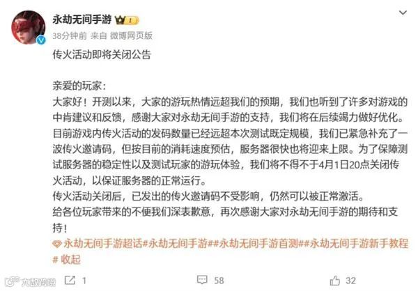 然而不久后官方再度发声,称大家的游玩热情远超预期,目前游戏内传火活动的发码数量已经远超本次测试既定规模。服务器很快也将迎来上限,为了保障测试服务器的稳定性以及测试玩家的游玩体验,将于4月1日20点关闭传火活动,以保证服务器的正常运行。