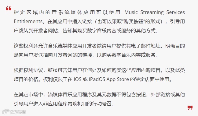 苹果公司在“3.1.1 (a),连接到其它购买方式”中添加了“Music Streaming Services Entitlements”(音乐流媒体服务权利)条款。(IT之家)