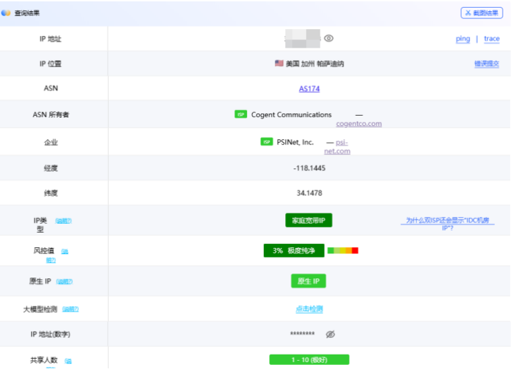 查看 IP 所属国家、城市、ASN、运营商,判断是否为住宅网络,以及定位是否准确。