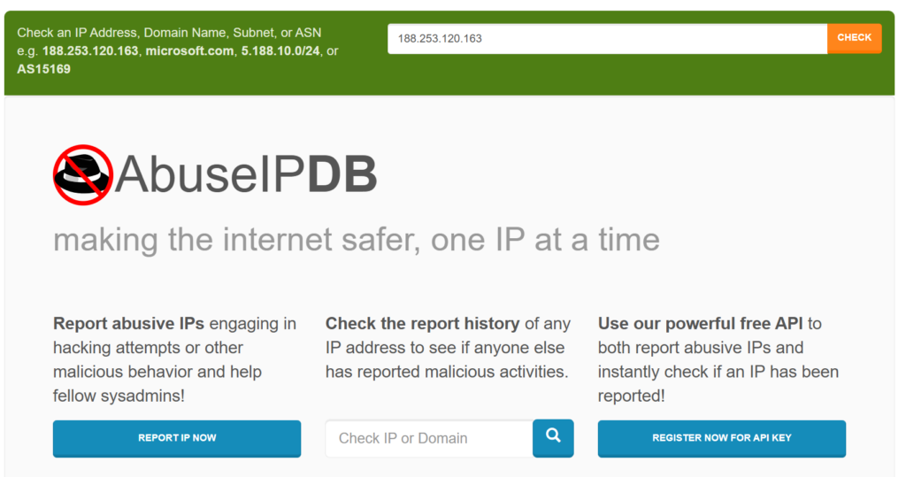 用于查看 IP 是否有垃圾流量、攻击、滥用记录,适合排查“黑历史 IP”。