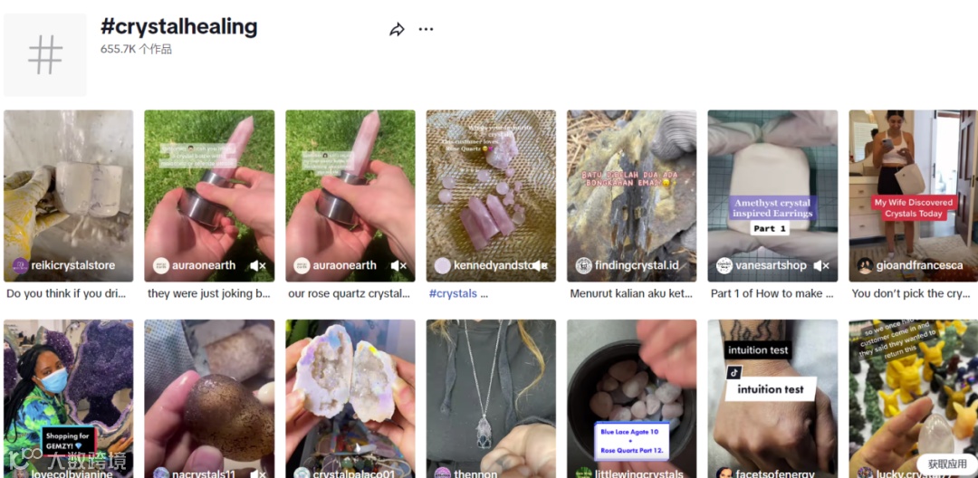 根据tiktokhashtags数据显示,“# Crystalhealing”标签可达19亿次浏览、“# Crystalshop”标签可达38亿次浏览。