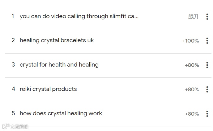 “healing crystal bracelets uk”(英国治愈水晶手链)、“crystal for health and healing”(健康和治愈水晶)、“reiki crystal products”(灵气水晶产品)、“how does crystal healing work”(水晶疗愈作用如何)等相关话题热度分别飙升100%、80%、80%、80%,由此可见,海外消费者对水晶产品的信仰和热爱十分浓烈。