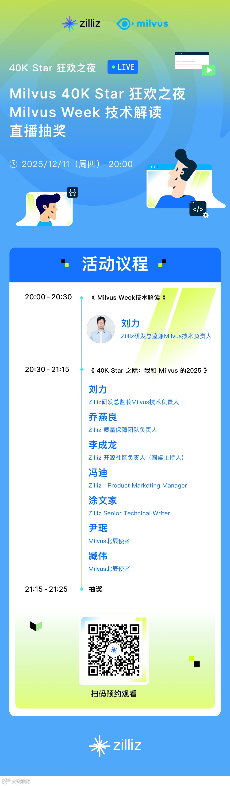 此外,Milvus各个团队的朋友也将一同亮相,在这个Milvus 突破4w Star的节点,聊聊2025年,我们在Milvus社区的那些回忆,并进行