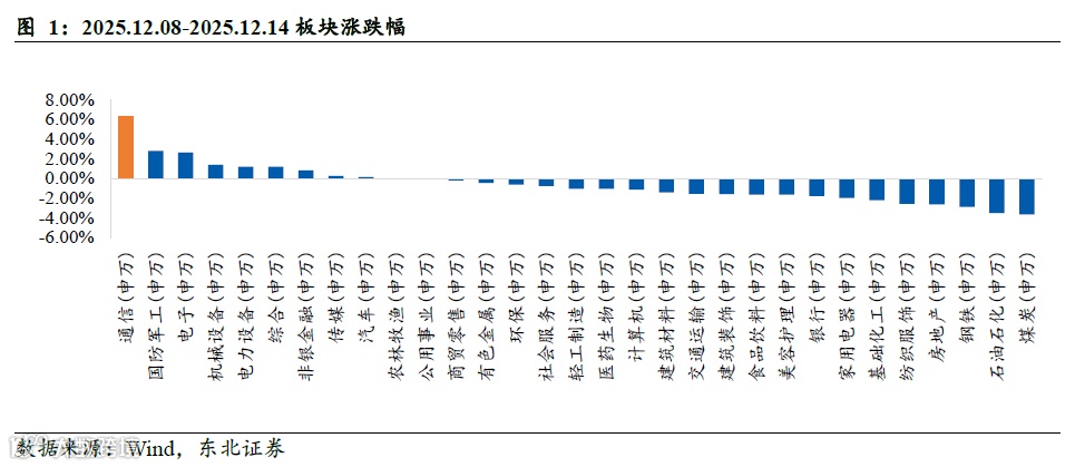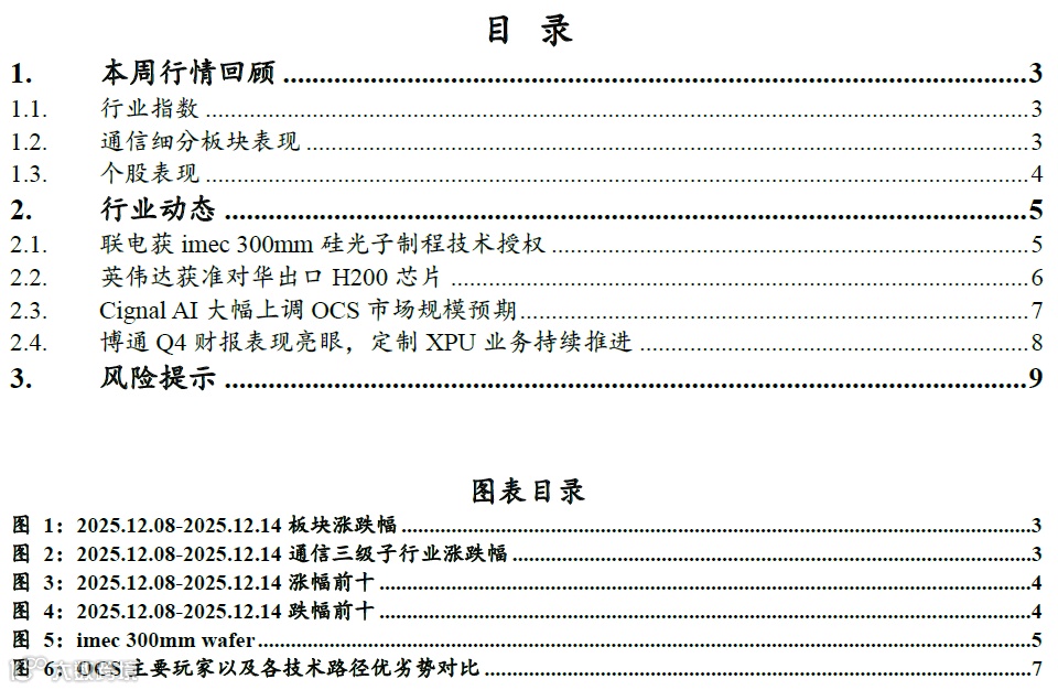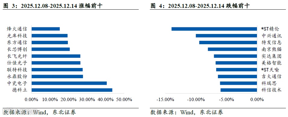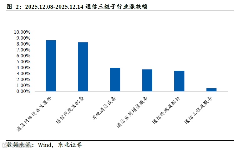 本周行情回顾:本周(2025.12.08-2025.12.14)申万通信指数上涨6.27%,上证指数下跌0.34%,深证成指上涨0.84%,创业板指数上涨2.74%,沪深300指数下跌0.08%,通信板块在31个申万一级行业中涨幅排名第一,显著跑赢大盘。本周通信三级子行业中,通信网络设备及器件涨幅最高 (8.62%),通信线缆及配套(8.28%)、其他通信设备(3.97%)、通信应用增值服务(3.71%)、通信终端及配件(3.46%)、通信工程及服务(0.52%)涨幅也较为明显。本周德科立(43.66%)、中瓷电子(40.65%)、永鼎股份(27.80%)涨幅分列前三,*ST精伦(-13.99%)、中兴通讯(-10.01%)、特发信息(-9.46%)跌幅分列前三。