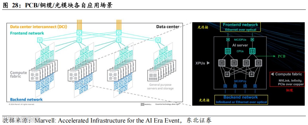 数据中心内部互联主要包含PCB/铜缆/光模块三种方案, PCB更新迭代和光连接在机柜内部的渗透引发市场对于铜缆生存空间与生命周期的担忧。