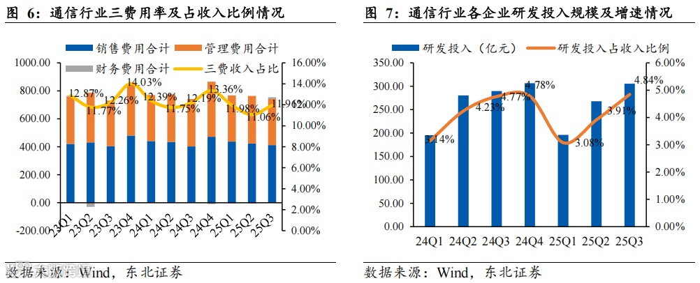 三费占比继续下降,研发投入相对稳定。2025年前三季度,通信行业三费占比分别为11.98%/11.06%/11.96%,维持近年来下降态势,销售及管理费用均有降低,行业公司不断优化内部管理降低成本提升盈利能力。从科研水平上看,2025年研发投入保持稳健,前三季度研发投入占比分别为3.08%/3.91%/4.84%,数据中心互连新技术、数字化转型、智能网联、物联网等快速发展驱动各公司提高研发投入,在产业变革中凭借科研水平提升核心竞争力。