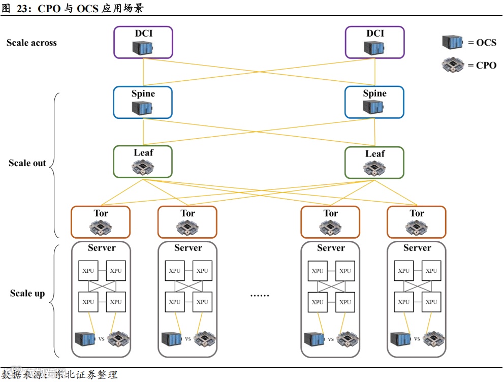 在scale out网络,CPO与OCS可搭配使用:CPO有望在Tor/Leaf层加速渗透,Leaf层流量的特点是突发性强,连接数量多,但各链路的数据量相对较小,CPO电交换机切换速度更快,能灵活快速响应Leaf层的流量需求;OCS在Spine层有望实现规模替代,Spine流量模式往往具有较强的可预测性和稳定性,OCS可提供稳定、大带宽的直连通道数据流。