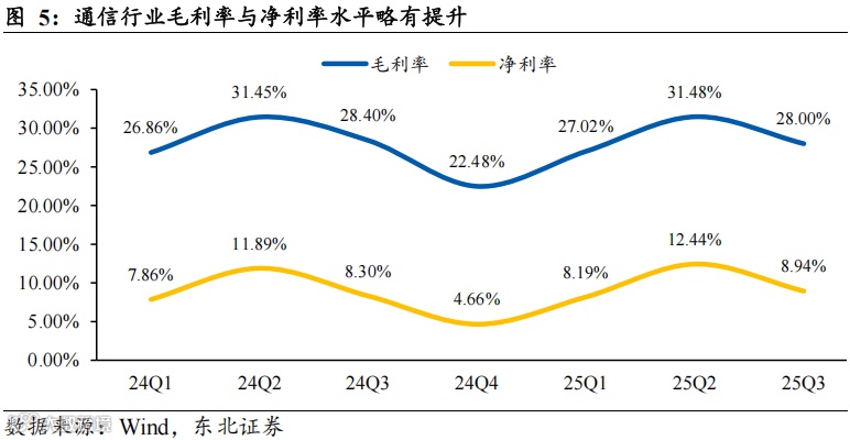 盈利能力较去年同期略有提升。2025年前三季度通信行业毛利率分别为27.02%/31.48%/28.00%,与去年同期相比略有提升;净利率分别为8.19%/12.44%/8.94%,较去年同期有所提升。整体来看,2025年受AI基础设施建设影响,通信行业盈利能力进一步改善。