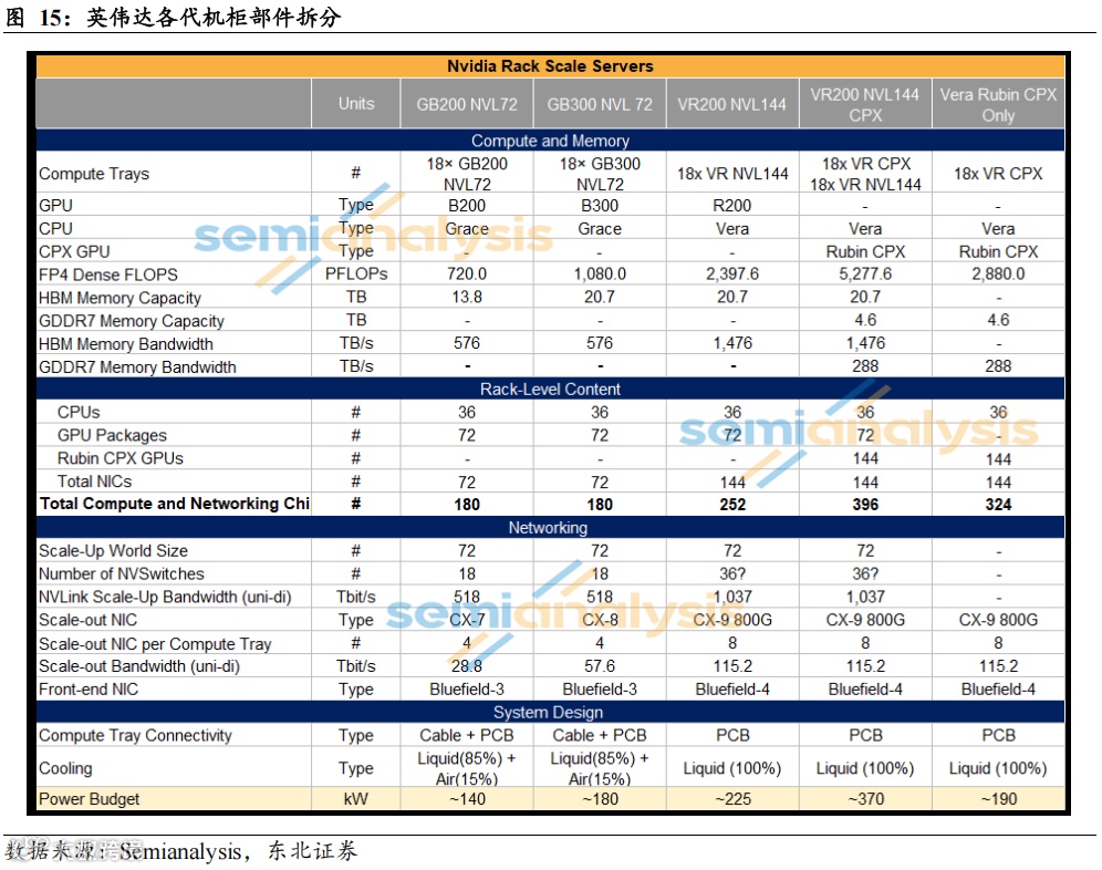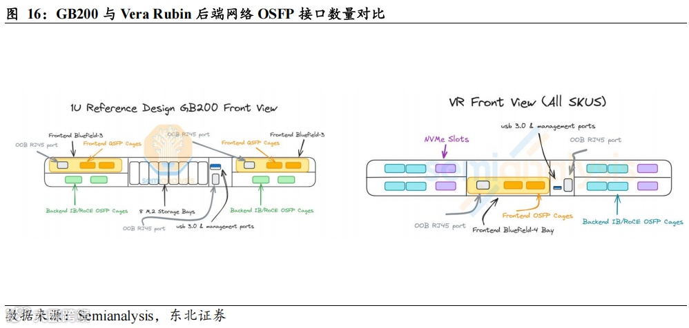 Vera Rubin进一步提升光模块配比。英伟达下一代Vera Rubin NVL144架构共包含18个compute tray(2*Vera CPU + 4*Rubin GPU),搭配8个800G CX-9网卡,每个CX-9连接到一个后端网络的OSFP光模块接口。基于三层无收敛网络架构测算,对1.6T光模块的需求将从Blackwell的1:2.5提高到Vera Rubin的1:5。据《联合报》报道,黄仁勋表示,下一代Rubin GPU已开始进入生产线。英伟达表示,Rubin GPU预计在2026年第三季度左右甚至更早进入大规模量产阶段。新一代Rubin GPU放量预计带来更多高速率光模块数量需求。